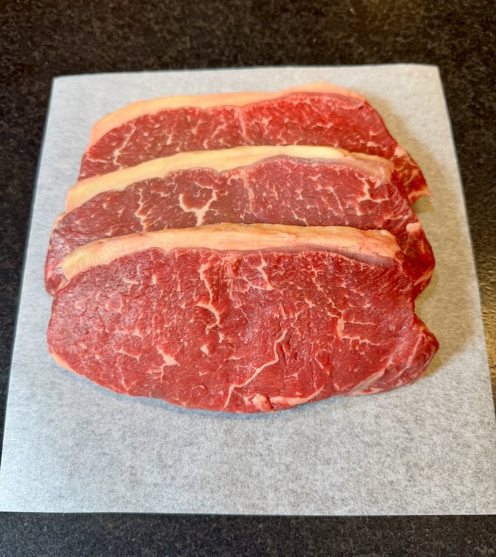 Stek z rozbefu, sezonowany na sucho minimum 30 dni. Plastry grubości około 1cm. Pakowany próżniowo. Termin przydatności do spożycia 14 dni.
